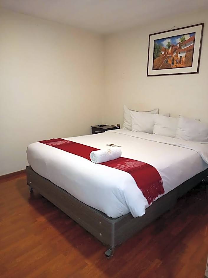 This spacious suite features a bedroom with a queen-size bed, a bathroom, a seating area and a kitchenette.